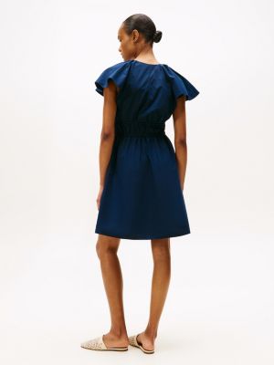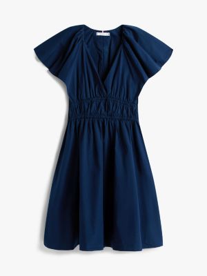 Welcome a playful addition to your warm-weather wardrobe with this cotton mini dress, featuring a flattering V-neck, shirred waist and frilled sleeves.